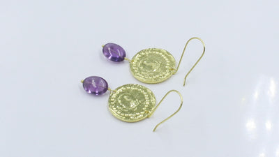 Hypoallergenic Brass Textured Drop Earrings with Amethyst Cabochons