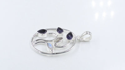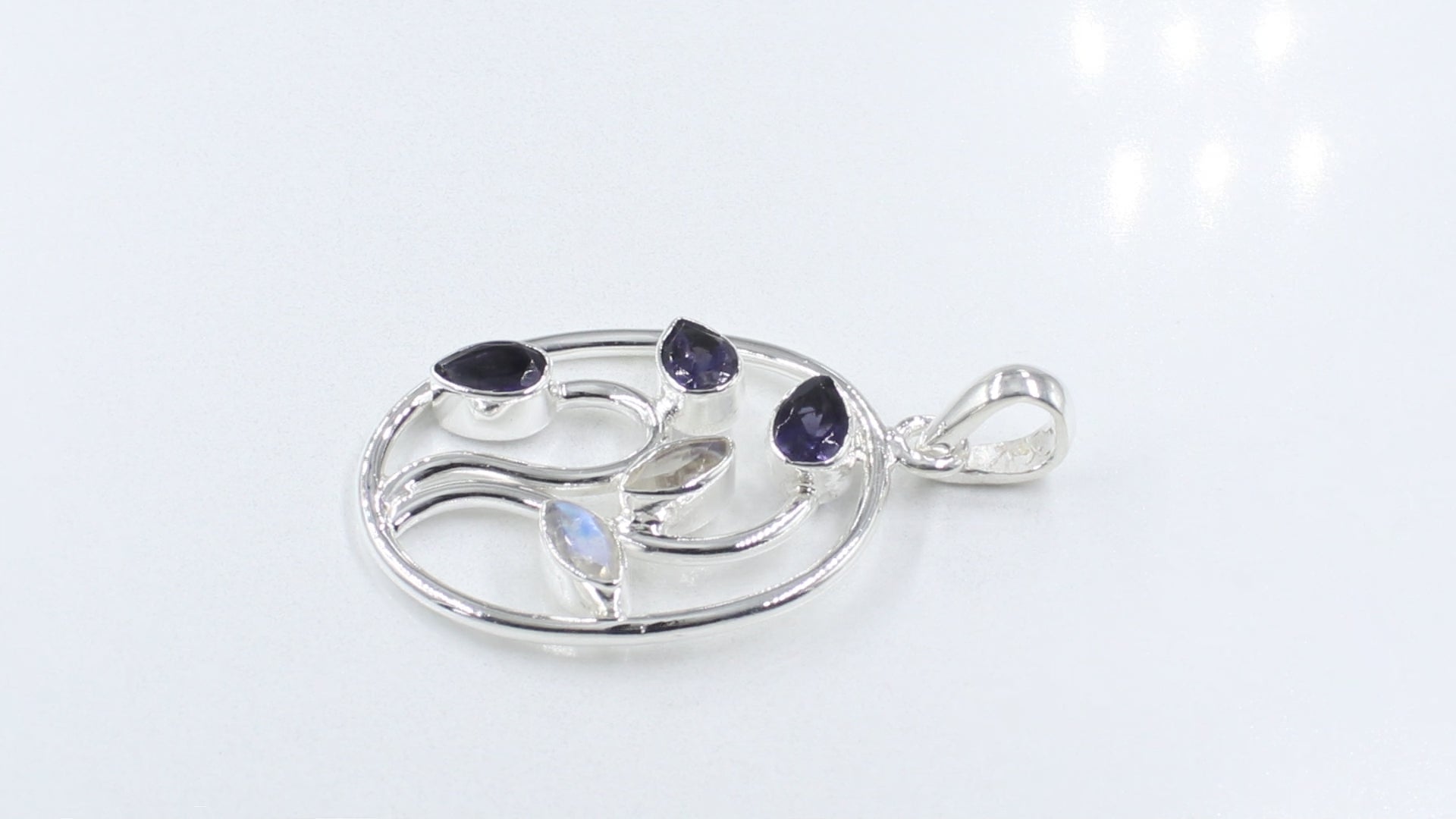 At the center of the pendant is iolite, a gemstone celebrated for its deep, vivid blue to violet hues. Faceted iolite stones are cut with multiple surfaces that catch and reflect light, creating a sparkling, multi-dimensional effect. The facets enhance the gemstone's natural brilliance and depth, making it a focal point of the pendant.