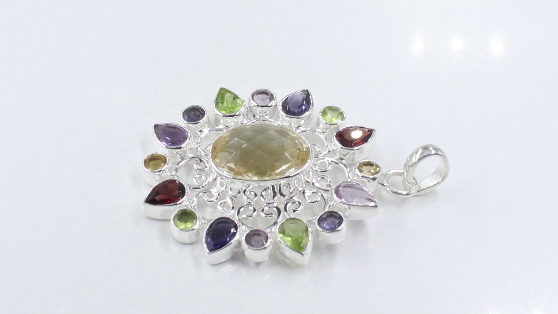 Multi-Gemstone Radiance Pendant in 925 Sterling SilverSize : US Size 5,6,7,8,9,10Packing : Comes in a Fancy Jute / Cotton DrawstringPouch.Metal : Soild 925 Sterling SilverFinish : Available in SilverStone :Amethyst, Citrine , Rainbow Moonstone Benefits of wearing silver:-• Physical well-being : Silver jewellery is known for its antimicrobial qualities, which help to keep surfaces clean...